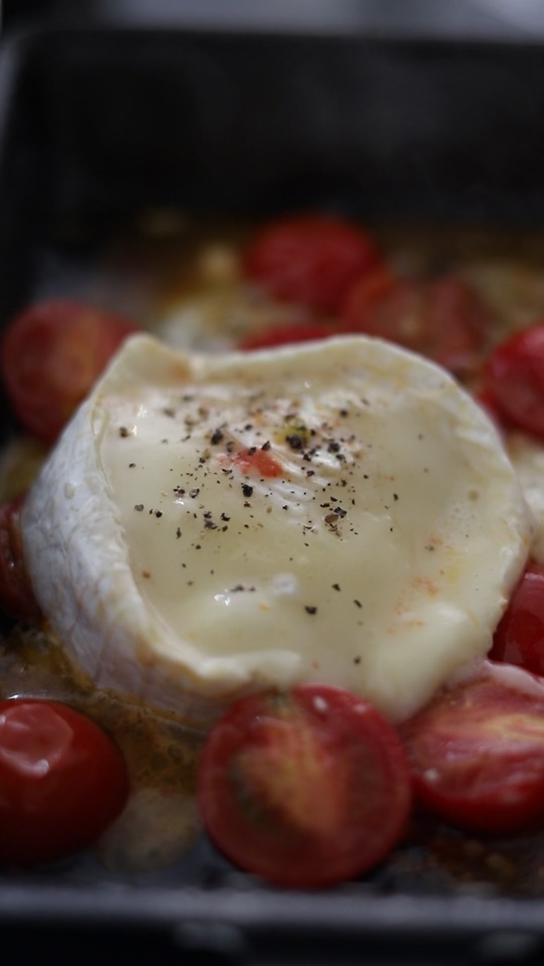 ③香りが立ったらミニトマトと塩麹を入れて絡める。フタをして中火で5分ほど蒸し煮に。カマンベールも加えて1分ほどさらに蒸す